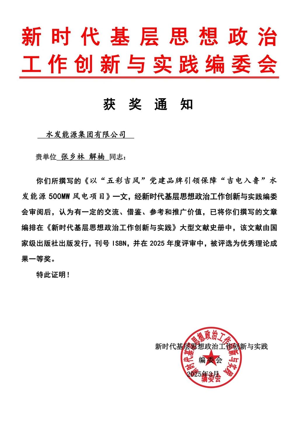 水發能源通榆公司“五彩吉風”黨建論文榮獲優秀理論成果一等獎