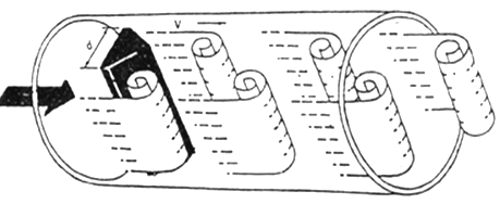 在流體中設置非流線型旋渦發生體(阻流體),則從旋渦發生體兩側交替地產生兩列有規則的旋渦,這種旋渦稱為卡曼渦街,如圖(一)所示。