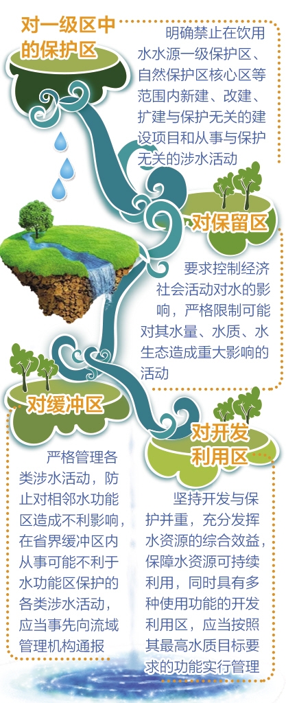 該辦法還對水功能區(qū)限制納污管理作了嚴格規(guī)定。石秋池說,為落實國務(wù)院對全國重要江河湖泊水功能區(qū)的批復(fù)要求和全面推行河長制的有關(guān)要求,辦法將水功能區(qū)限制納污管理作為核心內(nèi)容,從以下5個方面作了規(guī)定: